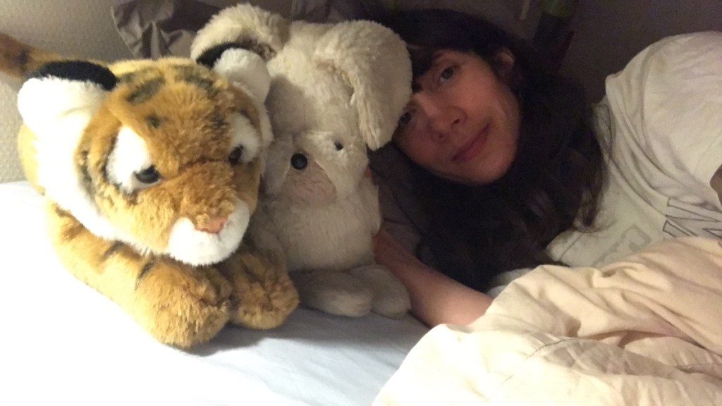 Ob Traum oder Realität, es macht mir Angst, vor allem Nachts – mehrfach wache ich schweißgebadet und nach Luft ringend auf, mir ist schwindelig, die Lungen füllen sich nur träge mit Luft, der Puls rast. Ich stehe auf und trinke ein Glas Wasser, versuche mich zu beruhigen. Eines der beiden Kuscheltiere, die ich seit Quarantäne-Beginn aus dem Schrank gefischt habe, der Tiger „Tigrou“, sieht mich schweigend an. In seinem Blick meine ich zu lesen: „Nur die Ruhe bewahren.“ Das andere Kuscheltier, „Tutu“, macht sich nichtmal die Mühe aufzuschauen, sondern bleibt einfach liegen und schläft weiter. Dann kann es doch nicht so schlimm sein. Ich streichele den beiden über den Kopf und lege mich wieder hin.